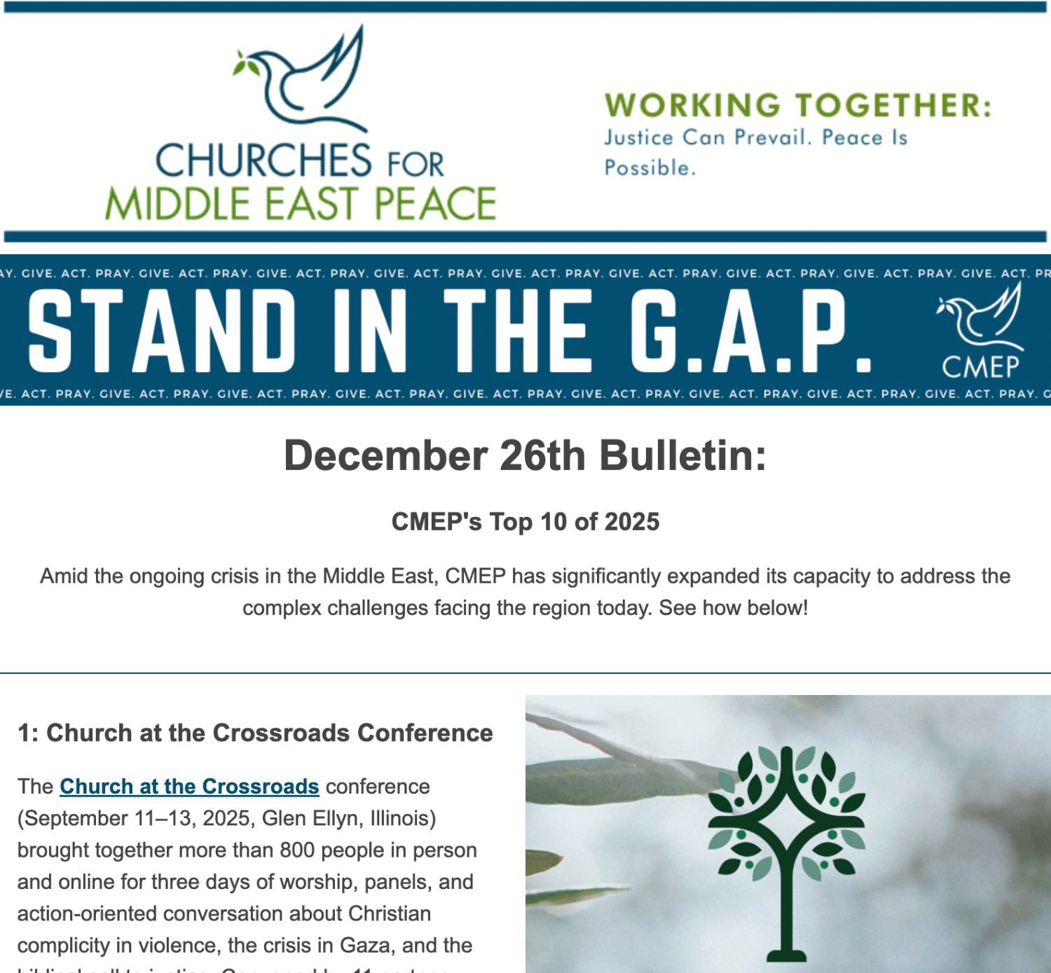 |  | January 2nd News Bulletin Here’s what’s upcoming and what you may have missed at CMEP and in the news. | | | | 1. Pardons and prizes: five key takeaways from Trump’s meeting with Netanyahu The Guardian "Donald Trump hosted Israel’s prime minister, Benjamin Netanyahu, for lunch at Mar-a-Lago on Monday. In remarks to reporters before, during and after their meeting, the two leaders said that they were in broad agreement on most issues, from next steps in Gaza and the possibility of bombing Iran again, to how very deserving Trump is of getting another award." | | | | | | 2. Israel to bar 37 aid groups as UK and EU warn of severe impact in Gaza BBC "Israel is to revoke the licences of 37 international non-governmental organisations (INGOs) working in Gaza and the occupied West Bank, saying they failed to meet requirements under new registration rules. ActionAid, International Rescue Committee, Médecins Sans Frontières and Norwegian Refugee Council are among the aid agencies which will have their licences suspended on 1 January, with their operations to end within 60 days." | | | | | | 3. Israel’s Somaliland move all about ‘strategic objectives’: Somali president Al Jazeera "Somalia’s President Hassan Sheikh Mohamud says Israel’s “unexpected and strange” recognition of Somaliland may have dire implications for Palestinians in Gaza and the Horn of Africa. “Somaliland has been claiming the secession issue for a long time, over the past three decades, and not one country in the world has recognised it,” Mohamud told Al Jazeera in an exclusive interview from Istanbul, Turkiye, on Tuesday." | | | | | | 4. ‘We want the mullahs gone’: economic crisis sparks biggest protests in Iran since 2022 The Guardian "Alborz, a textile merchant in the central Iranian city of Isfahan, decided he could no longer sit on the sidelines. He closed his shop and took to the streets, joining merchants across Iran who shuttered their stores and students who took over their campuses to protest against declining economic conditions." | | | | | | 5. UAE says it will withdraw its remaining forces in Yemen after Saudi Arabia struck port city CNN "The United Arab Emirates said Tuesday that it was pulling out its remaining forces in Yemen, after Saudi Arabia bombed the war-torn country’s port city of Mukalla following accusations that two ships from the UAE had delivered weapons and combat vehicles to separatist forces." | | | | | | 6. Syria imposes curfew in Latakia days after protests turn violent, state media says Reuters "Syrian security forces imposed a curfew on Latakia city, a bastion of the country's Alawite minority, state media reported on Tuesday, days after four people were killed in protests that spiralled into violence. Syria has been rocked by several episodes of sectarian bloodshed since longtime leader Bashar al-Assad, who hails from the Muslim Alawite community, was ousted by a rebel offensive last year and replaced by a Sunni-led government." | | | | | | 7. Victory against Israeli West Bank settlement offers Palestinians some hope Al Jazeera "For Alice Kisiya, a Palestinian Christian activist from Beit Jala in the occupied West Bank, this Christmas season is special. On Tuesday, Kisiya was able, for the first time since 2019, to set foot on her family’s land in the Christian village of al-Makhrour after an Israeli court ruling in June eventually forced Israeli settlers to leave the land and dismantle an illegal outpost." | | | | | | 8. Holy Land’s top Catholic leader visits Gaza parish, greeted by children in Santa hats and keffiyeh Holy Land Christian Ecumenical Foundation "The top Catholic leader in the Holy Land visited the Gaza Strip’s only Catholic church on Friday to share a message of Christmas hope and support as conditions in the war-torn territory slowly improve while the Israel-Hamas ceasefire holds into its third month. Cardinal Pierbattista Pizzaballa was greeted by children in Santa hats and keffiyeh — the checkered headscarf that’s a global symbol of Palestinian nationalism — in the courtyard of the church compound, which was gaily decorated with twinkling lights and Christmas ornaments." | | | | | | 9. American Evangelicals’ Declining Support for Israel Arab Center Washington DC "Evangelical Christian support for Israel and its policies has long been one of the bedrock factors behind backing for Israel in the United States. Such support pervaded all sectors of American decision making at the executive and legislative levels and produced seemingly unlimited material, diplomatic, and political assistance to Israel. Recently, however, Evangelical backing of Israel has declined, leading to panic among Israeli policymakers and pro-Israel advocates, who are responding with major new initiatives to regain such support." | | | | | | | | Still Active: ACTION ALERT "Block the Bombs Act" On May 21st, 2025, House Resolution 3565 was introduced to the U.S. House of Representatives, also known as the "Block the Bombs Act." The resolution calls for a limit on the sale of bombs, ammunition (including white phosphorus), and ammunition manufacturing capability. The act comes as Israel has strengthened its assault on Gaza and the West Bank, with an estimated death toll since October 7th, 2023 standing at 54,000 Palestinian men, women, and children. Congress needs to pressure the Trump Administration to protect Palestinian civilians through the passage of HRes. 3565. Your voice can push your representative to support this vital resolution and limit offensive weapon capabilities of Israel, protecting Gazan civilians from relentless bombs. Contact your representative and urge them to support the initiative. | | | | | | | | Peacebuilding Lessons from the Middle East February 16, 23, March 2, 9, 2026 | Noon–2 PM Instructor: The Rev’d Mae Elise Cannon, PhD, Executive Director of Churches for Middle East Peace (CMEP) Offered at Berkeley Divinity School at Yale In