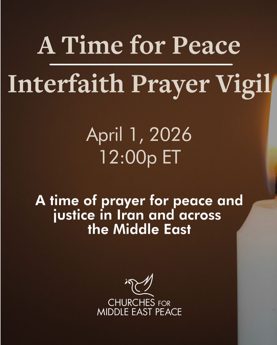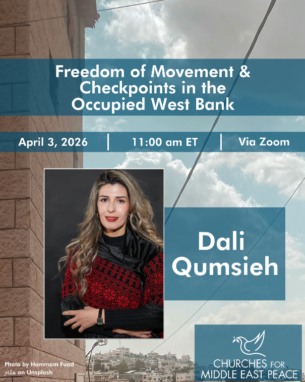 | April 1, 2026: 'A Time for Peace' Interfaith Prayer Vigil Join original signatories, including CMEP executive director Rev. Dr. Mae Elise Cannon, and supporters of the A Time for Peace statement on April 1st at noon ET to pray for peace and justice across the Middle East. As the statement proclaims, now is the time for religious leaders everywhere to take meaningful, constructive steps toward lasting peace and to extinguish the flames of enmity and hatred. Learn more and register. |