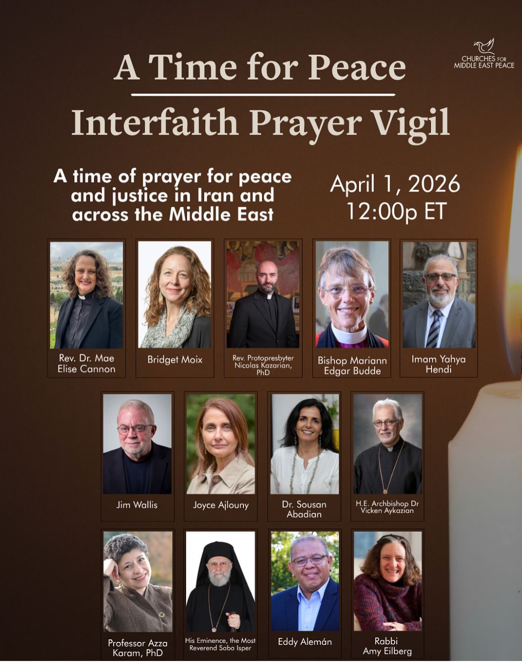 April 1: A Time for Peace Vigil Recording On April 1, 2026, amid escalating violence in Iran, Israel, Lebanon and across the Middle East, Churches for Middle East Peace (CMEP) hosted a prayer vigil centering the calls of the "A Time for Peace" statement. The vigil included prayerful remarks from several esteemed multi-faith leaders, including CMEP's executive director Rev. Dr. Mae Elise Cannon.