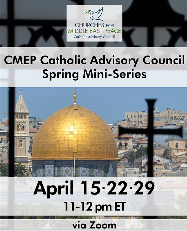 | April 15, 22, 29th, 2026: CMEP Catholic Advisory Council Spring Mini-Series The Catholic Advisory Council of Churches for Middle East Peace (CMEP) is excited to invite you to a special three-part Spring Mini-Course series. This series, hosted weekly April 15, 22, and 29 at 11 ET on Zoom, will explore how Catholic and Christian communities in the Holy Land are responding to the profound challenges of life under occupation and ongoing conflict. Together, we’ll examine key areas of interest to Catholics (and all Christians) in the U.S. and hear from key partners and institutions on the ground in the Holy Land. We look forward to having you join us for these powerful and timely sessions. |