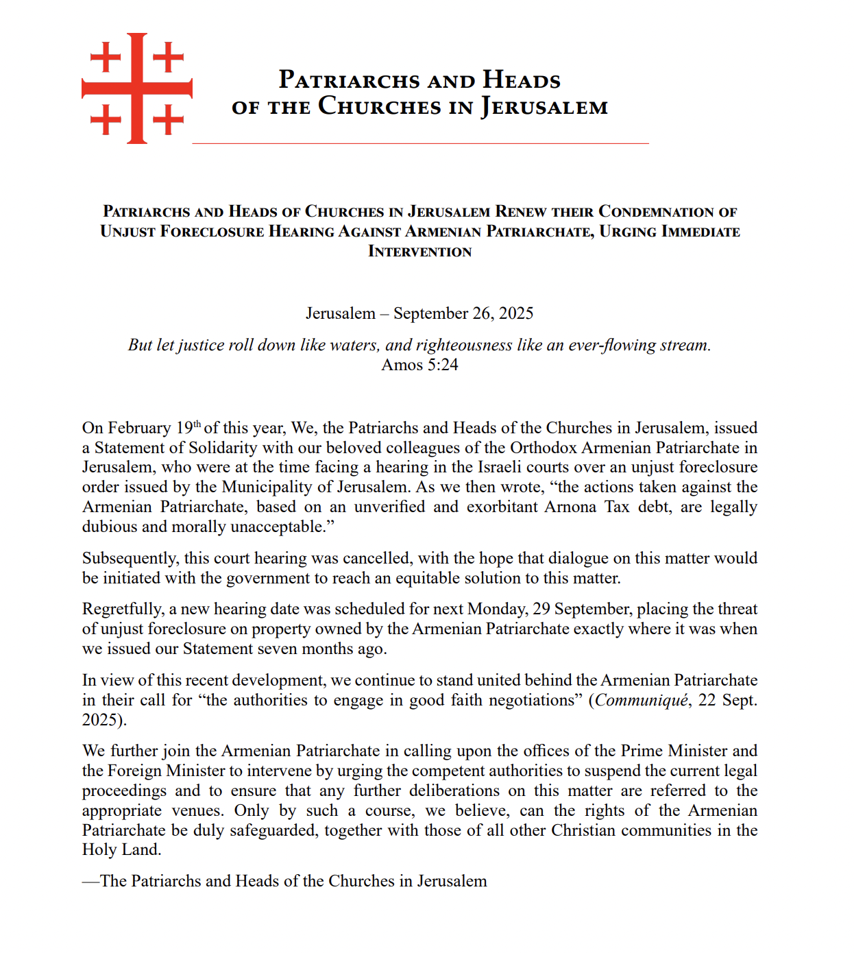 | FOR IMMEDIATE RELEASE Washington, D.C. - September 30, 2025 | | Media Contact: media@cmep.org (202) 543-1222 CMEP Echoes Patriarchs and Heads of Churches in Jerusalem on Armenian Patriarchate Foreclosure Threat | | September 30, 2025, Washington D.C.- Churches for Middle East Peace (CMEP) echoes the urgent call of the Patriarchs and Heads of the Churches in Jerusalem and stands in unwavering solidarity with the Armenian Patriarchate. This renewed foreclosure threat is not merely a legal dispute; it is a direct challenge to the centuries-old Status Quo that safeguards the presence and witness of Christian communities in the Holy Land. Targeting the Armenian Patriarchate with unjust and disproportionate financial burdens undermines the sustainability of the Church’s ministry, weakens the fabric of Jerusalem’s diverse religious life, and sets a dangerous precedent for all Christian institutions. We urge immediate intervention by Israeli authorities and international actors to halt these proceedings and engage in constructive dialogue that respects religious freedom, protects historic Christian rights, and upholds justice in the city that is sacred to Jews, Christians, and Muslims alike. You can read the full statement HERE or below. | |  | | | | | | Formed in 1984, Churches for Middle East Peace (CMEP) is a coalition of more than 30 national church communions and organizations, including Catholic, Orthodox, Protestant, and Evangelical traditions that works to encourage US policies that actively promote a comprehensive resolution to conflicts in the Middle East with a focus on the Israeli-Palestinian Conflict. CMEP works to mobilize US Christians to embrace a holistic perspective and to be advocates of equality, human rights, security, and justice for Israelis, Palestinians, and all people of the Middle East. | | | | | | Recent CMEP Statements and Press Releases: Sep 18, 2025: CMEP Statement on the Freezing of the Greek Orthodox Patriarchate of Jerusalem’s Bank Accounts On August 6, 2025, the Jerusalem Municipality froze the bank accounts of the Greek Orthodox Patriarchate of Jerusalem. This action is deeply troubling, both in its immediate impact and in its broader implications. It constitutes a direct violation of the historic Status Quo that has governed Jerusalem for centuries and threatens the ability of the Churches to provide vital spiritual, educational, charitable, and social services to their communities. Sep 15, 2025: CMEP Condemns the Jerusalem attack by Hamas and the Israeli attack on Qatar as further escalations in the ongoing Israel/Hamas War Churches for Middle East Peace (CMEP) is appalled by the alarming escalation of violence across the Middle East over the past week in the ongoing battle between Israel and Hamas. Civilians pay the highest price. The violence must stop, and the ongoing killing must be brought to an end. The cycle of brutality continues to devastate lives, fueling greater insecurity and suffering for all. Sep 12, 2025: Joint Statement: “A Death Sentence” – Aid Agencies Warn of Israel’s Assault on Gaza City 45 Humanitarian and civil society organizations warn that Israel’s assault on Gaza City amounts to a death sentence. Intensified Israeli military attacks on Gaza City and forced displacement orders for the entire city are leaving families with an impossible dilemma: flee and risk death on the road and in overcrowded displacement areas, or stay and face relentless bombardment in their shelters. Aug 27, 2025: Churches for Middle East Peace Elevates the Joint Statement by the Greek Orthodox Patriarchate of Jerusalem and the Latin Patriarchate of Jerusalem Churches for Middle East Peace affirms the joint statement from the Greek Orthodox and Latin Patriarchates of Jerusalem as a cry from the heart of the Christian community in the Holy Land, a prophetic voice of truth spoken amid unbearable suffering. Their words remind us that what is unfolding in Gaza is not an abstraction, but the lived reality of hundreds of thousands of men, women, and children, including the faithful who have sought refuge within the very walls of the Church. The Patriarchates’ declaration that there can be “no future based on captivity, displacement of Palestinians or revenge” is both a moral compass and a summons to the global conscience. Aug 26, 2025 Joint Statement: The Latest Planned Israeli Military Offensive in Gaza City Must Be Halted Churches for Middle East Peace (CMEP) joined twenty church-based organizations in calling for Israel to halt its planned military offensive in Gaza City. With famine already declared in Gaza, further military operations will only cause further suffering and death for a civilian population without anywhere else to go. As the letter reads, “this displacement will result in a modern-day death march that is clearly intended to ethnically cleanse half of the Gaza Strip and compress all of Gaza’s population into a tiny sliver of territory incapable of sustaining life.” The letter calls on all parties, including the United States, to use all leverage available to call upon the Israeli government to reverse its plans for a military offensive in Gaza City and to instead pursue a durable and lasting ceasefire. See all of our public statements and press releases. | | | | Contact Us Churches for Middle East Peace (CMEP) 110 Maryland Ave NE, Suite 505 Washington, District of Columbia 20002 (202) 543-1222 info@cmep.org | | | | | | | |